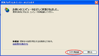 「更新を有効にするには、コンピュータを再起動してください。」というメッセージにしたがい、 画面下の「今すぐ再起動」 をクリックして再起動します。これでWindowsには最新の更新プログラム(セキュリティパッチ)が適用されたことになります。 |